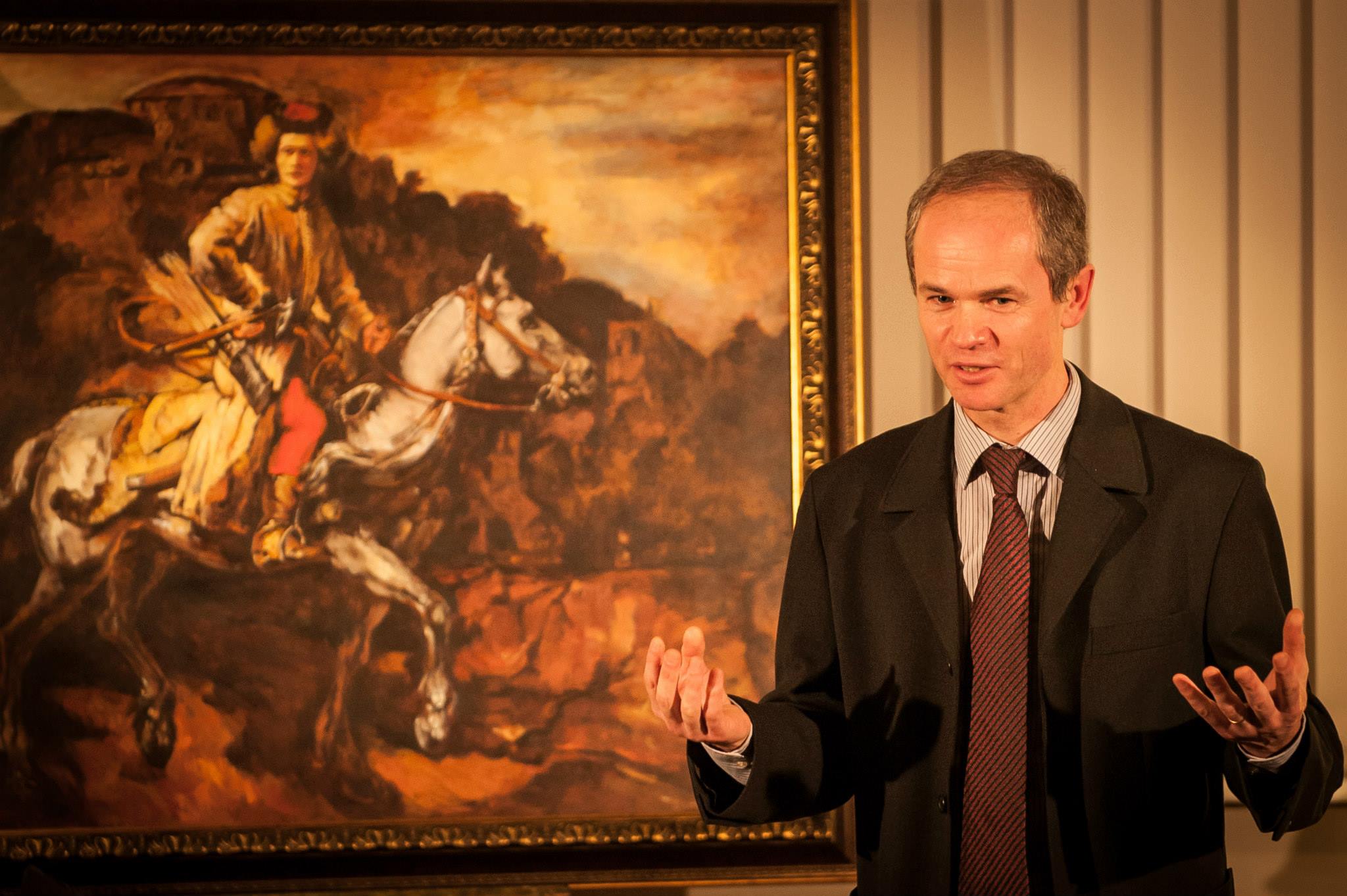Renginys „Mykolas Kleopas Oginskis: tėvynei skiriu turtus, darbus ir gyvenimą“. Rembranto paveikslo "Lenkų raitelis" kopiją pristato Kaišiadorių muziejaus direktorius Olijardas Lukoševičius. 2013 m. lapkričio 28 d. Kaišiadorių muziejus. A. Sabonytės nuotr.