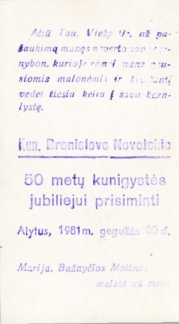 „Aš, Novelskis Bronius, gimiau 1905 mt. gruodžio mėn. 20 d. Palomenės km. Kaišiadorių r., valstiečių šeimoje. mano tėvai: Jurgis Novelskis ir Antanina Tatarūnaitė. Paugėjęs pas tėvus ganiau gyvulius. 1915 mt. artinantis vokiečiams išbėgome į Rusiją ir apsigyvenome Smolensko gub. Roslavlio apskr. Černuškų km. Tų pat metų žiemą įstojau į lietuvių pabėgėlių prieglaudą Roslavlio mst. Prie prieglaudos buvo 2jų klasių pradžios mokykla, kurią baigęs 1918 mt. grįžau į Lietuvą. Ne kurį laiką padėjau tėvams dirbti žemę. 1920-1923 mt. baigiau Žiežmarių vidurinę 4ių klasių mokyklą. 1923/24 m. m. išėjau „Aušros“ gimnazijos 5tą klasę Kaune. 1924-1931 m. mokiausi Kauno kunigų seminarijoje Kaune, kurią baigęs 1931 mt. buvau įšventintas kunigu ir paskirtas į Molėtus vikaro ir vidurinės 4ių kl. mokyklos kapeliono pareigoms. Čia dėsčiau tikybą ir lotynų kalbą. Šias pareigas ėjau iki 1934 mt. balandžio mėn. pabaigos. 1934.V.1 iki 1935.IV.1 išbuvau Zibalų bažnyčios administratorium. Nuo 1947 mt. rugsėjo mėn. pradžios Salų bažn. (Rokiškio r.) administratorium ir ten dirbau iki 1953 mt. liepos mėn. vidurio, iš kur Vyskupo Paltaroko buvau perkeltas į Užpalius bažn. administratoriaus pareigoms. Iš ten išvykus, 1956 mt. balandžio 16 d. Kauno Vysk. Valdytojo Kan. Stankevičiaus buvau paskirtas į Alytaus I bažn. klebonu, kur po šiai dienai dirbu eidamas šias pareigas.”