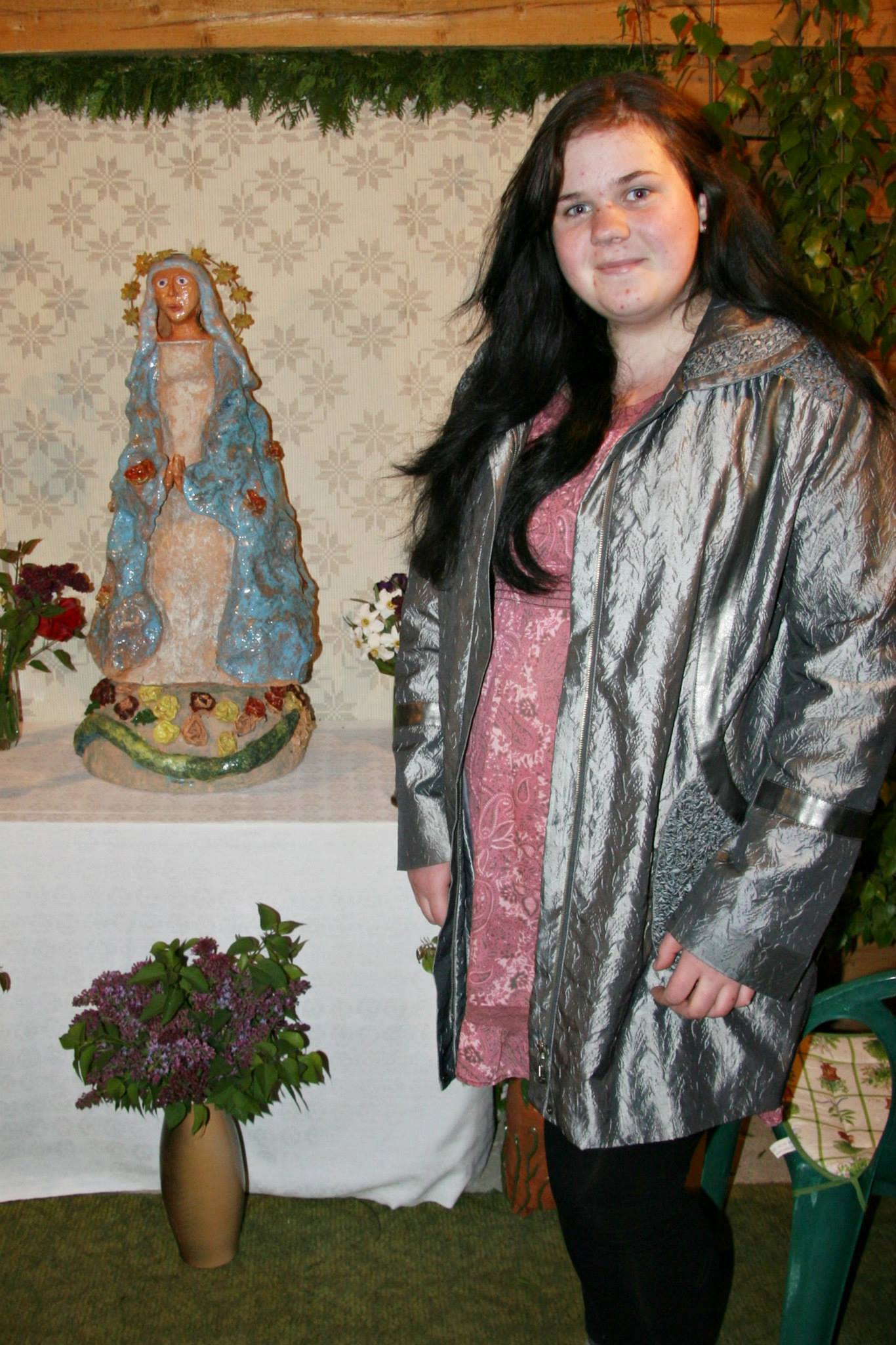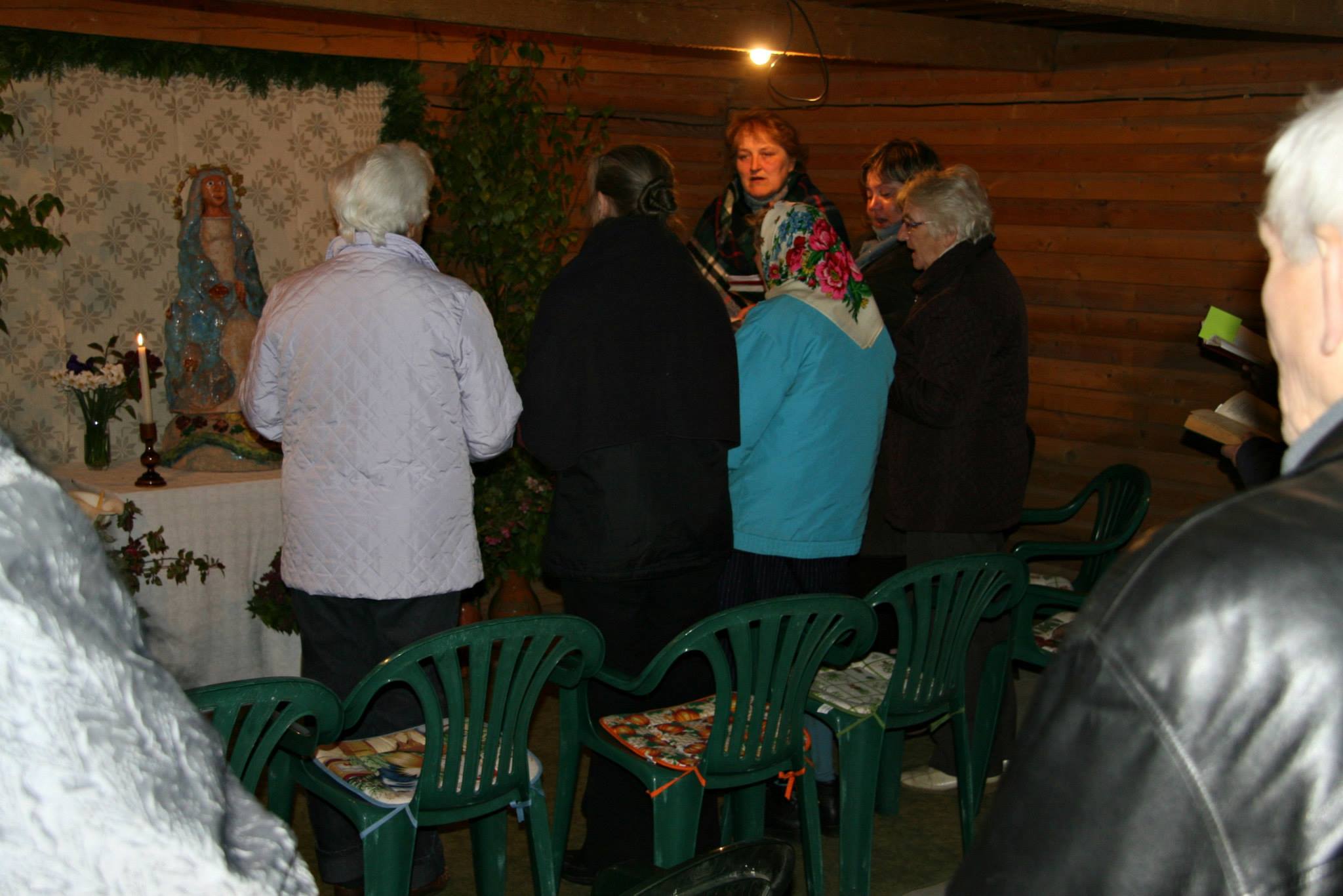 Nu, tas ir yra, tęsiasis jau, tęsias Marijos garbinimas, nu. Kad metai, kai tik gegužis, tada jir, jir tęsias pamaldos Marijai. Visi, kiek jau metų daug. Oi jau man aštuoniasdešims. O dą, o jau aš ėjau, vedėsis mama, jir va, nu. Nu, jir visi kap tai, sujuda jir susiruošia, jir kur ne ką nepakalbisi, oi gegužės, kada va, dabar jir pas mane dar balandžio mėnesį: ar darysi? Ar padarysi? Nu, taip. Jir kiek jau metų čia gyvenamė, jir vis pas mane. Nu, jir, jir moterys eina, jau vietoj, jaunimo, jaunimo nėra, kad būtų. Dabar mieste jaunimas visas, nu, o šitos mūs. Jir puošia, neša. Kai buvo, dar, dar buvo kaimas na, daugiau, tai kiek prisirinkdavo. O dabar jau mažiau, bet...