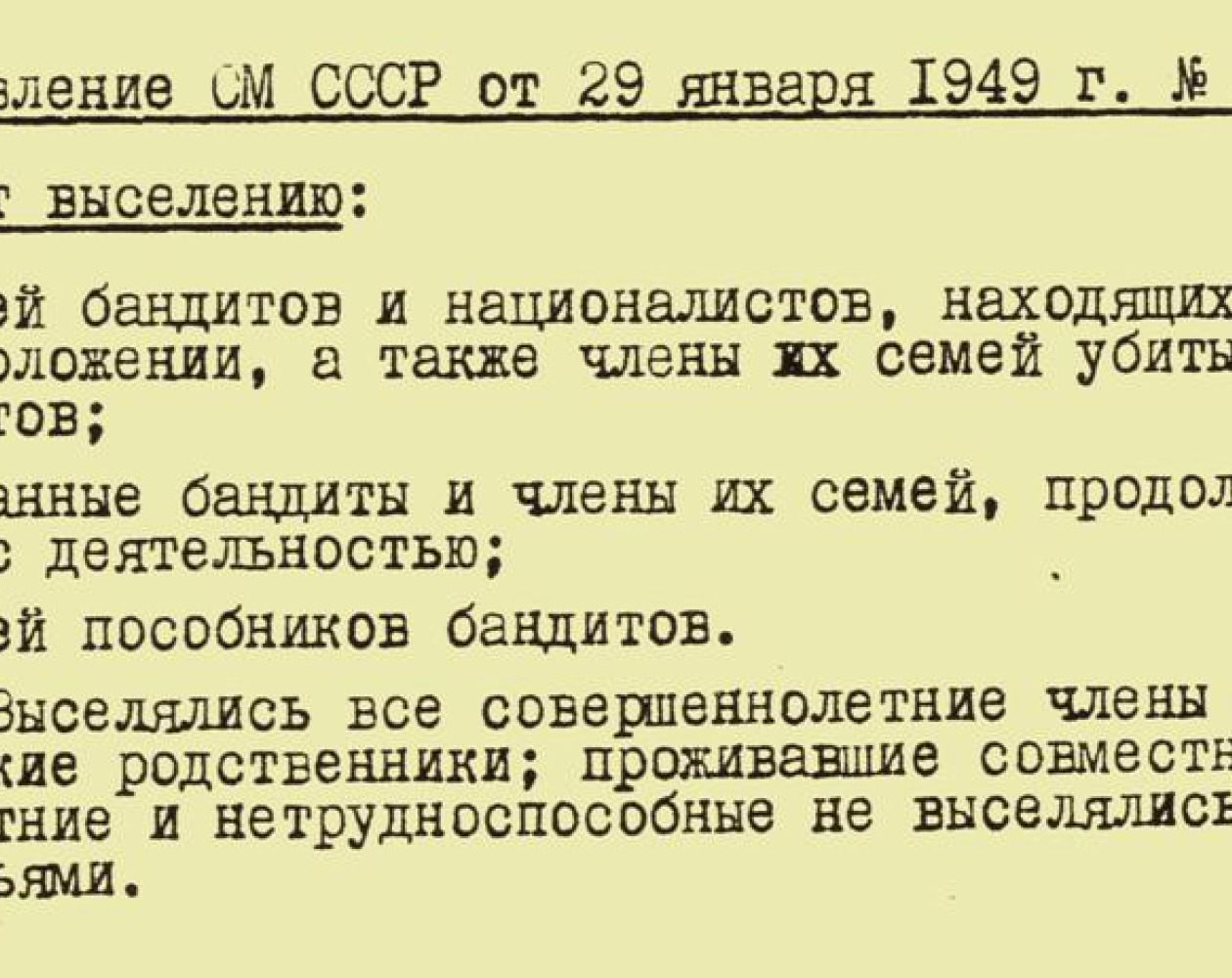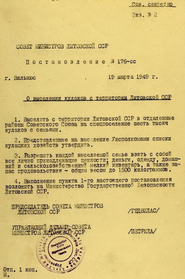 1949 m. sausio 29 d. SSRS Ministrų taryba priėmė nutarimą Nr. 390-138 v.s. (visiškai slaptai) „Dėl buožių su šeimomis iškeldinimo iš Lietuvos, Latvijos ir Estijos teritorijos...“. Tą nutarimą Maskvoje, Kremliuje, pasirašė SSRS Ministrų tarybos pirmininkas J. Stalinas ir SSRS Ministrų tarybos reikalų valdytojas J. Čadajevas.