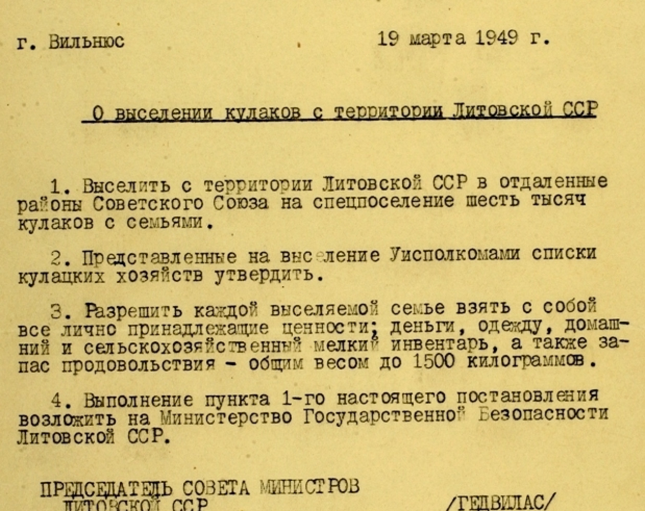 šeimomis į tolimus Sovietų Sąjungos rajonus specialiajai tremčiai“. Minėtą nutarimą 1949 m. kovo 19 d. pasirašė Lietuvos SSR Ministrų tarybos pirmininkas M. Gedvilas ir Lietuvos SSR Ministrų tarybos reikalų valdytojas D. Petryla. Remiantis tuo nutarimu, sudaryti tremiamųjų sąrašai.