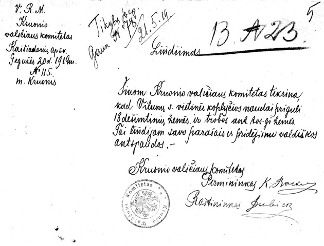 Pirmojo Kruonio valsčiaus viršaičio Kostanto Bačkausko pasirašytas raštas dėl Vilūnų koplyčiai priklausančių žemių. Kruonis, 1919 m. gegužės 20 d. Lietuvos centrinis valstybės archyvas.