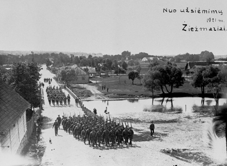 Lietuvos kariuomenės kariai grįžta iš pratybų. Žiežmariai, 1921 m. Lietuvos centrinis valstybės archyvas. Fotodokumentų skyrius.