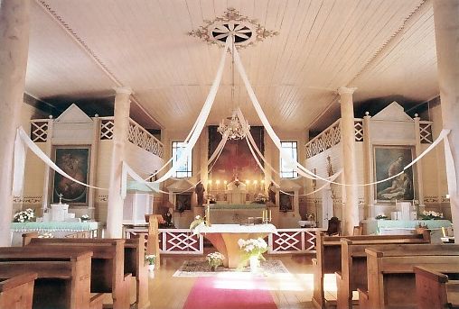 Viduje bažnyčia erdvi, perdengimas plokščias, apvalios kolonos dalija interjerą į tris navas. Dailus interjero puošybinis elementas – presbiterijos ir choro ažūrinės drožinėtos medinės grotelės ir užtvaros.