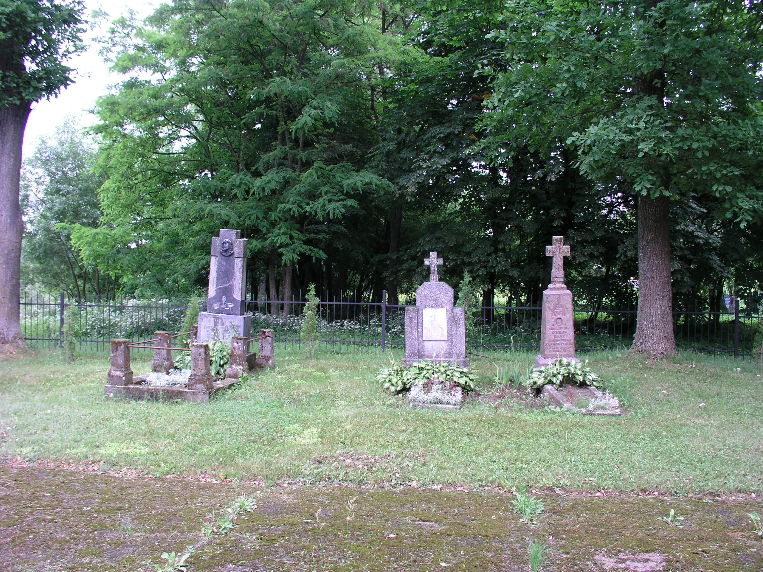 Palomenės klebonų kapai bažnyčios šventoriuje. Čia palaidoti (iš kairės): Vincentas Valavičius, Jonas Tutinas ir Jurgis Zimkus. 2011 m. R. Gustaičio nuotr.