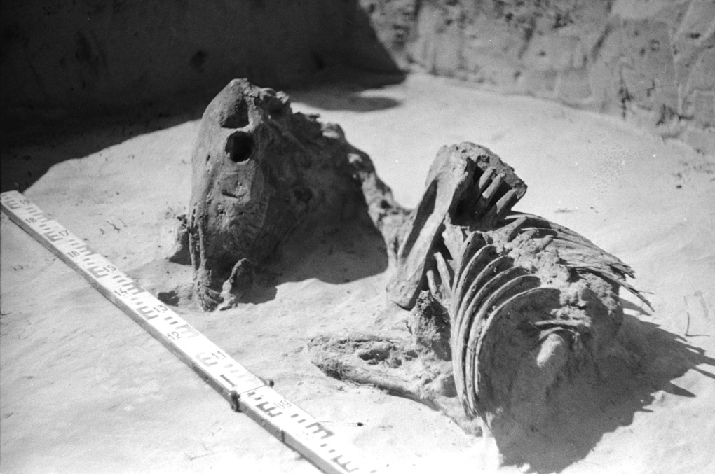 Pilkapyno šiaurės vakarinėje dalyje aptikti žirgų kapai. Iš viso ištirti 8 griautiniai, 7 degintiniai ir 7 simboliniai žirgų kapai. Nedeginti žirgai buvo laidojami pilkapio centre, pirminiame žemės paviršiuje iškastose duobėse. Žirgai buvo paguldyti ant šono galva į vakarus (tik pilkapyje Nr. 29 – galva į rytus). Sudegintų žirgų kaulai buvo supilti į pirminiame žemės paviršiuje arba sampile iškastas duobutes. Simboliniuose kapuose buvo palaidotos tiktai apdegusios arba ugnies neliestos žirgo įkapės.