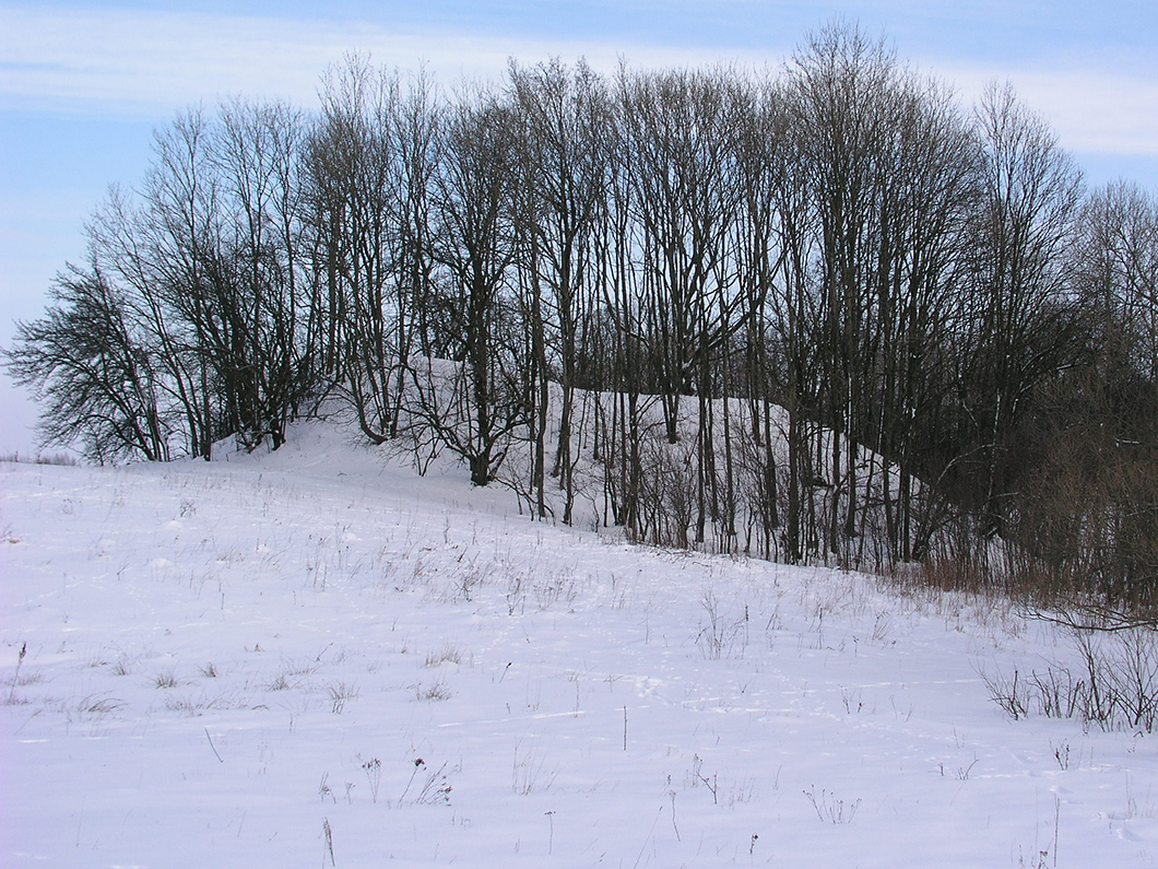 Piliakalnio aikštelėje yra senos duobės pėdsakai.